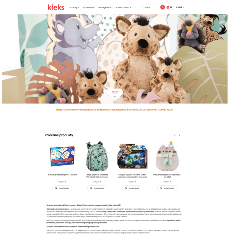Kleks prosperuje również stacjonarnie, a więc rodzice z podopiecznymi mają możliwość do niego kierować się w takiej sytuacji, kiedy tylko mają na to chęć i oczekiwać, że zostaną obsłużeni na bardzo wysokim pułapie. Kleks znany jest z tego, iż w filii stacjonarnej działa wyjątkowo miły kącik dla maluchów. Jest to miejsce przyjemne, które zachęca wprost do kolejnych odwiedzin. Wiodące podkategorie, w obrębie których można zrobić zakupy to: Do szkoły, Do zabawy, Dla artystów oraz Dla biura i domu. W każdej z tych podkategorii da się wyszukać nad wyraz sporo produktów. Przeznaczone są one na równi dla dzieci młodszych, młodzieży, ale też dla rodziców. Od markowych zabawek, przez artykuły szkolne, do biura, albo do robienia projektów artystycznych, można spodziewać się, iż odnajdzie się wyroby z certyfikacją, sprawdzone oraz takie, które będą w pełni rozwijały wyobraźnię. W sklepie specjalną podkategorią są zabawki, które nie tylko są przeznaczone do zabawy, lecz także pomogą rozwinąć wyobraźnię a także nauczą tego co dzieje się wokół.